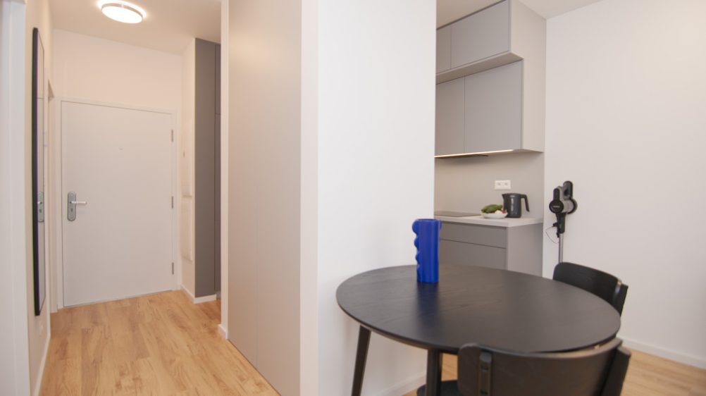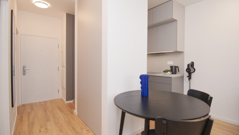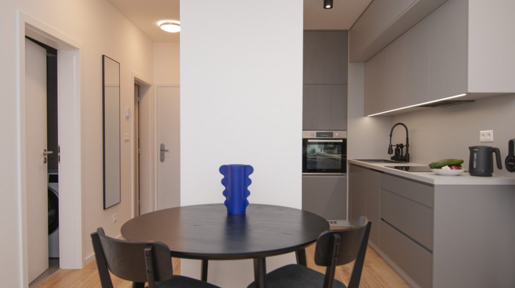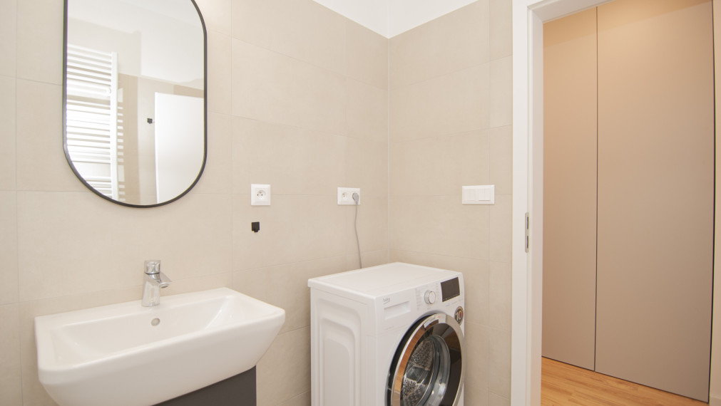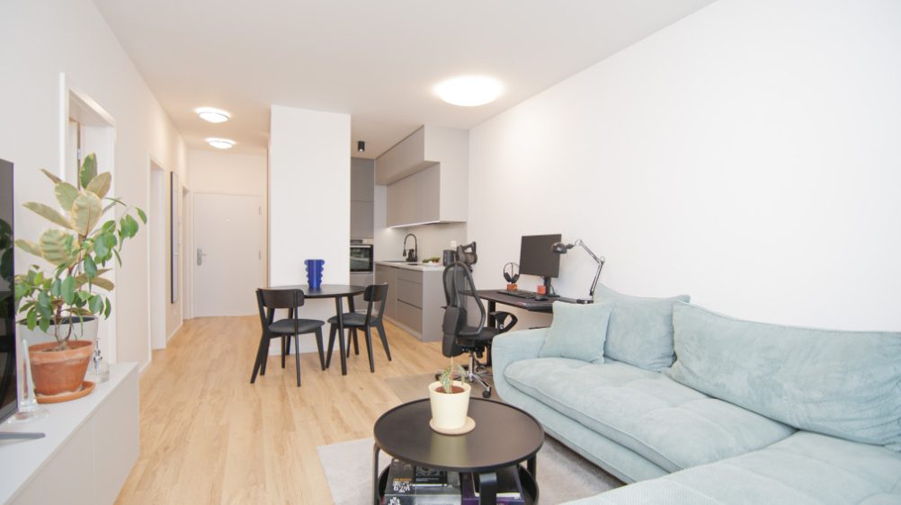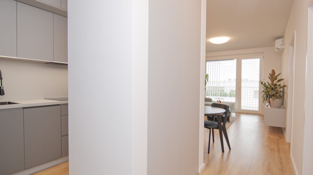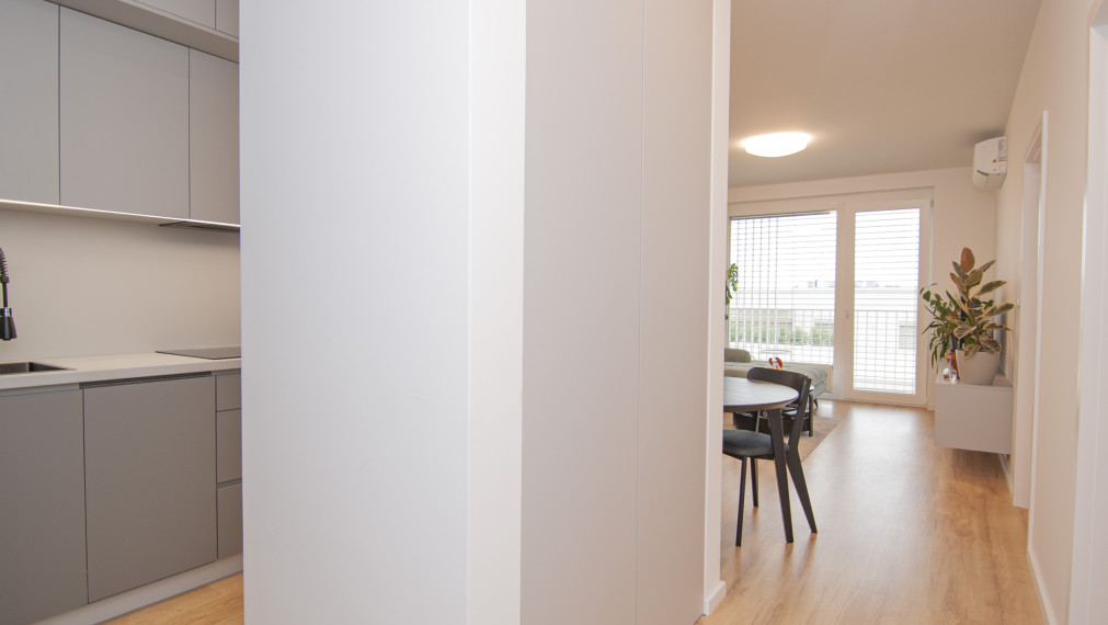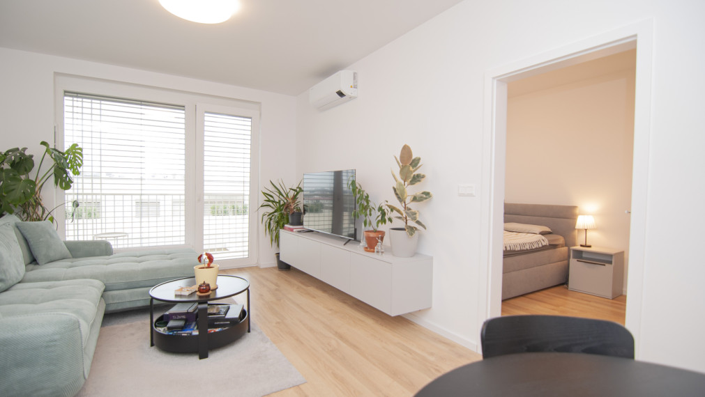 For sale 2-room apartment in the new project Nový Ružinov, multi-functional building Evelyn on Bajkalská street in the district of Bratislava- Ružinov. The property area is 62 m2, including a storage room and a balcony along both rooms with a view of the courtyard. The apartment is sold fully furnished, including a sofa, double bed, TV, and appliances. The apartment features air conditioning, electric aluminum blinds, recuperation, and built-in wardrobes. The price includes an outdoor parking space. Excellent location with quick access to the city center and the highway, developed infrastructure, parks, and playgrounds.
