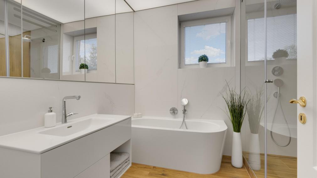 - bathroom with bathtub and shower cubicle
