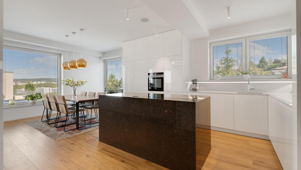 - open kitchen with granite island, equipped with quality appliances, a unique dining table and a spacious living room with access to the loggia