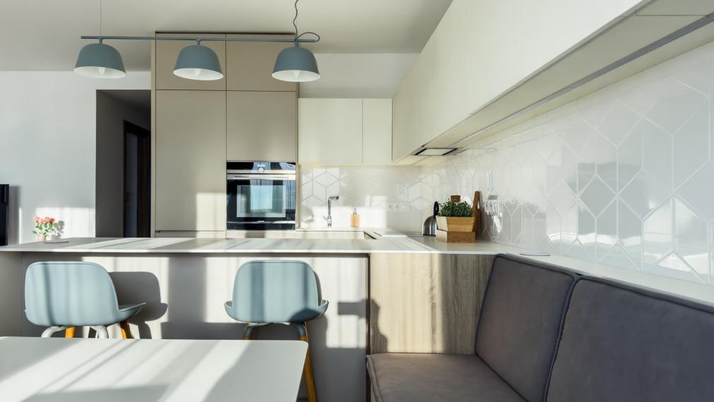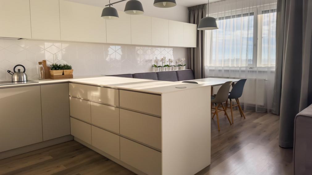 - open kitchen with dining area, equipped with high-quality Siemens appliances, a dining table, and a spacious living room with access to the larger of the loggias