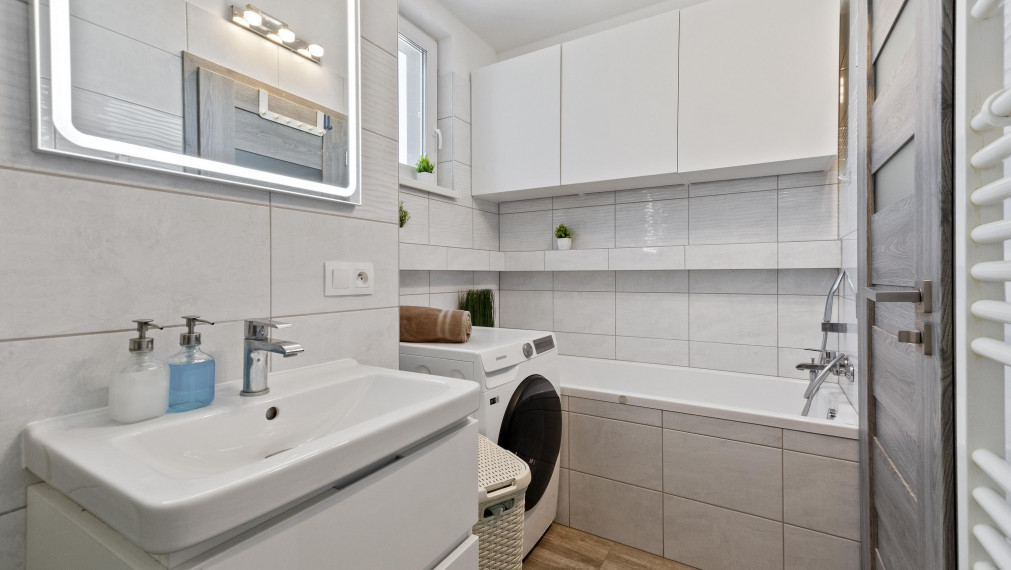 - Bathroom with separate bathtub, shower, and space for a washing machine, LED mirror