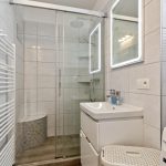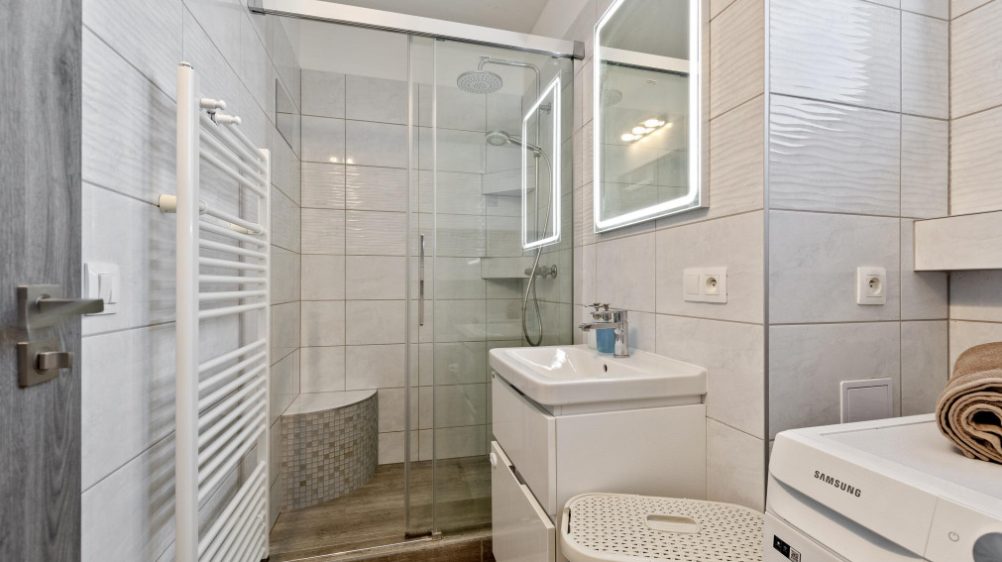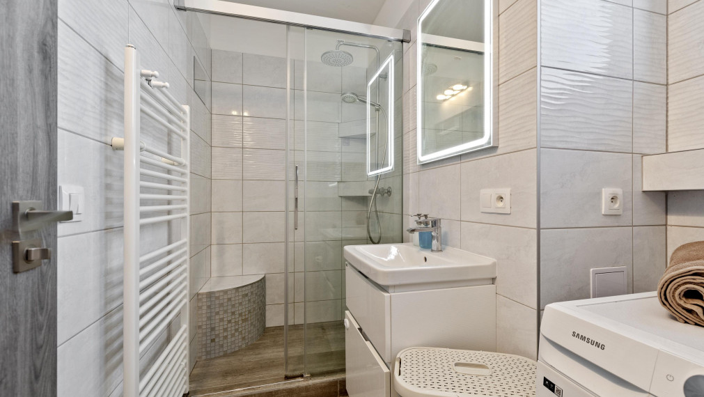 - Bathroom with shower and bathtub, LED mirror, ladder radiator