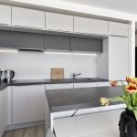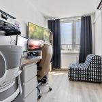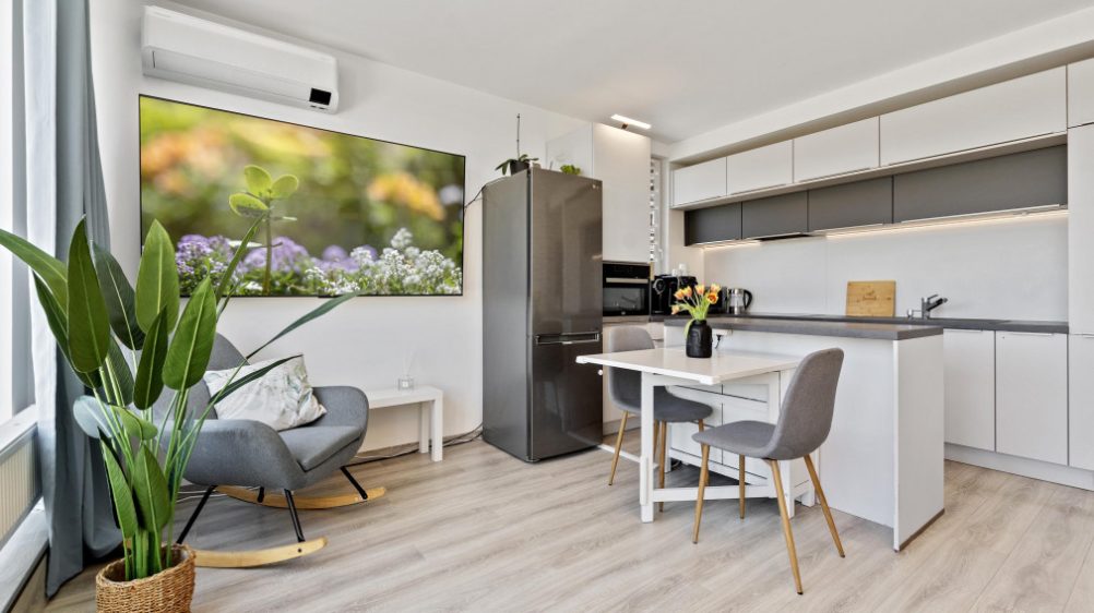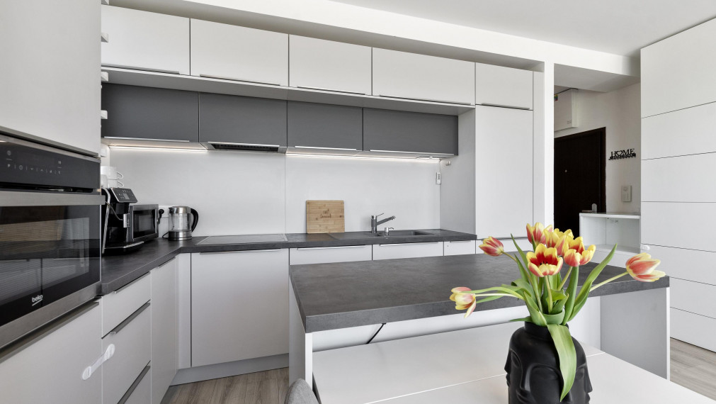 - Kitchen unit: L-shaped with an island, illuminated by an LED strip with adjustable light intensity, built-in appliances: Bosch hob + Beko electric oven, extractor hood, built-in 60cm Bosch dishwasher, 2 refrigerators (1 freestanding, 1 built-in), stone sink, L-shaped sofa bed, cabinets with push system