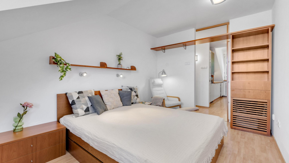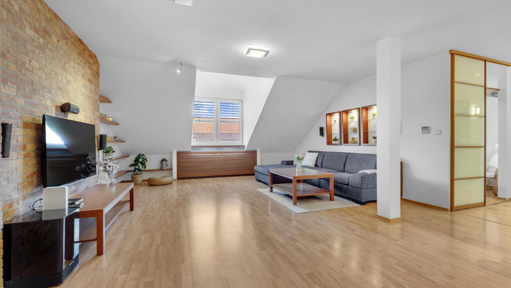 This spacious attic apartment with excellent layout and atmosphere is an ideal solution for those who desire an unconventional, airy, and bright space, an excellent location, and full civic amenities literally under the windows.