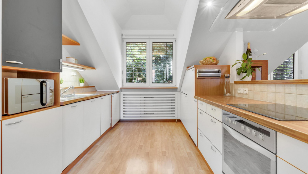 This 3-room attic apartment (with the possibility of conversion to a 4-room apartment) was created in 2003 (the brick apartment building dates back to 1958) as an attic conversion and is located on the 3rd floor without an elevator. Although older, the apartment is well-maintained and suitable for immediate occupancy without further investment. There are only 8 apartments in the building.