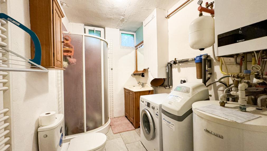 Heating and water heating are provided by a Buderus boiler with a storage tank, and a water softener filter.