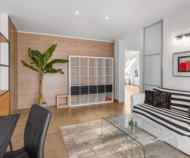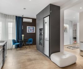 kitchen unit with appliances ( hot air oven, dishwasher, refrigerator with freezer, induction glass-ceramic hob, extractor hood) washing machine combined with a dryer, dining table with chairs, sofa set, coffee table, Led smart TV, bed 160x200, spacious wardrobe, bedside tables, wall-mounted air conditioning with TV cabinets, shoe rack with hangers, curtains and drapes.
