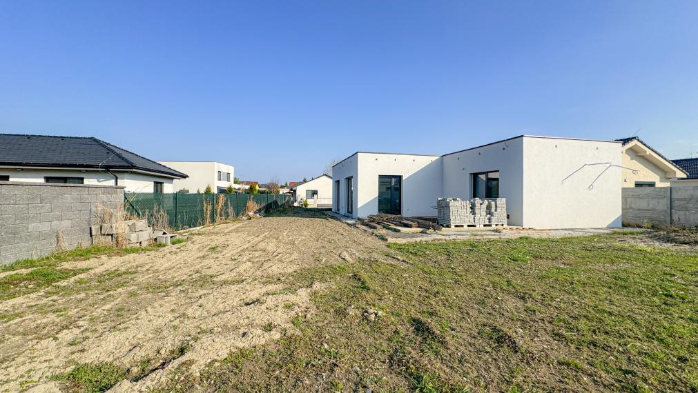 Pozemok je úplne upravený a z 3 strán oplotený, terasa je vydláždená a poskytuje priestor na oddych aj rodinné posedenia. Parkovanie je riešené na priestrannej ploche pred domom pre 3-4 autá.