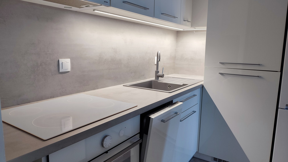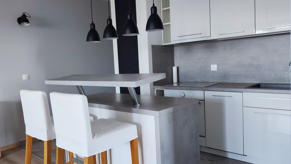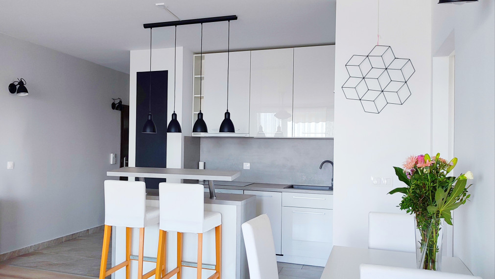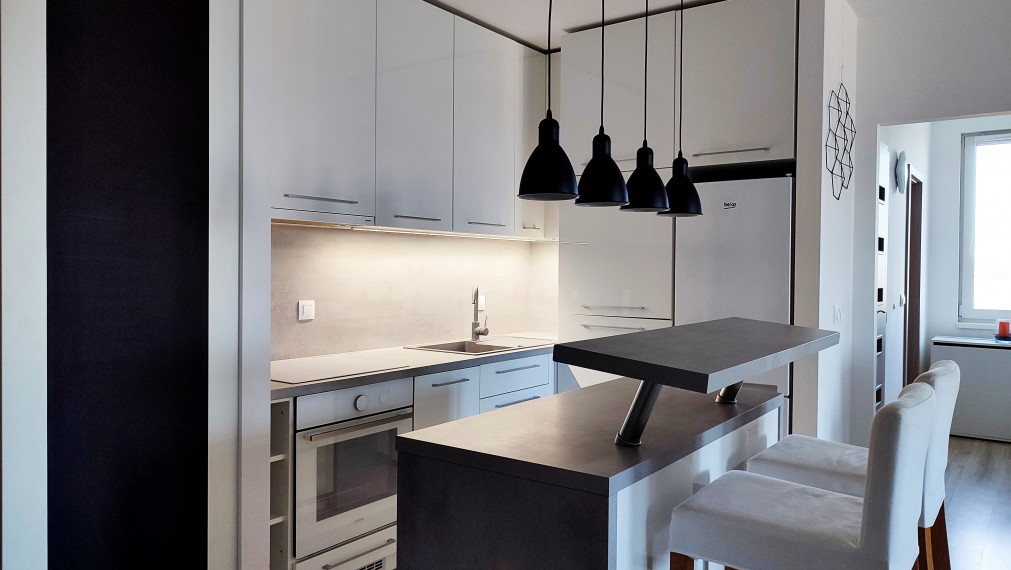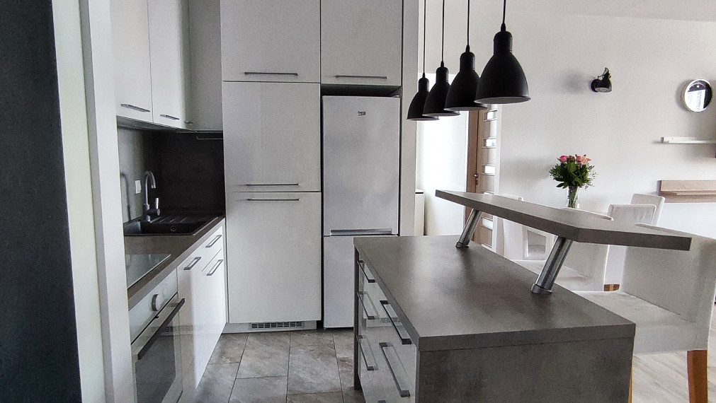 - Kitchen: custom-made L-shaped kitchen with an island and 2 bar stools, built-in appliances: hob + electric oven + Gorenje brand extractor hood, built-in 45 dishwasher and Beko brand freestanding refrigerator, ceramic sink, faucet