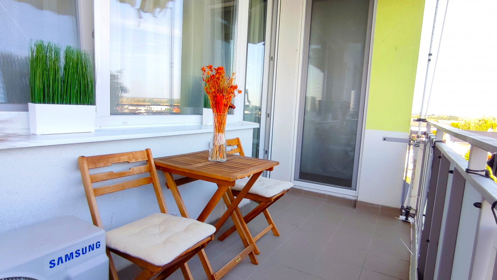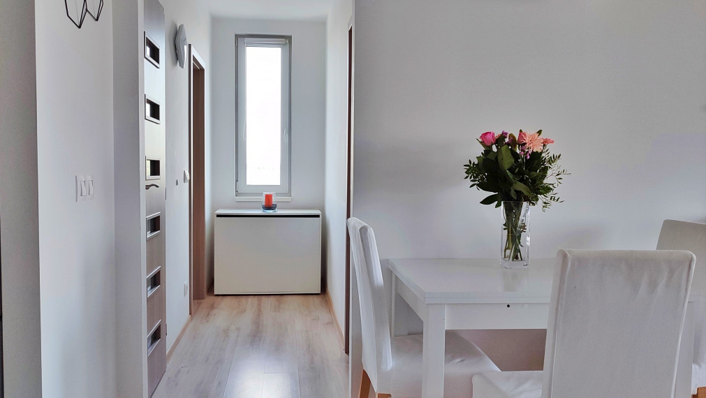 - Spacious living room with a kitchen, extendable dining table with access to the balcony with an awning and a view of Small Paradise