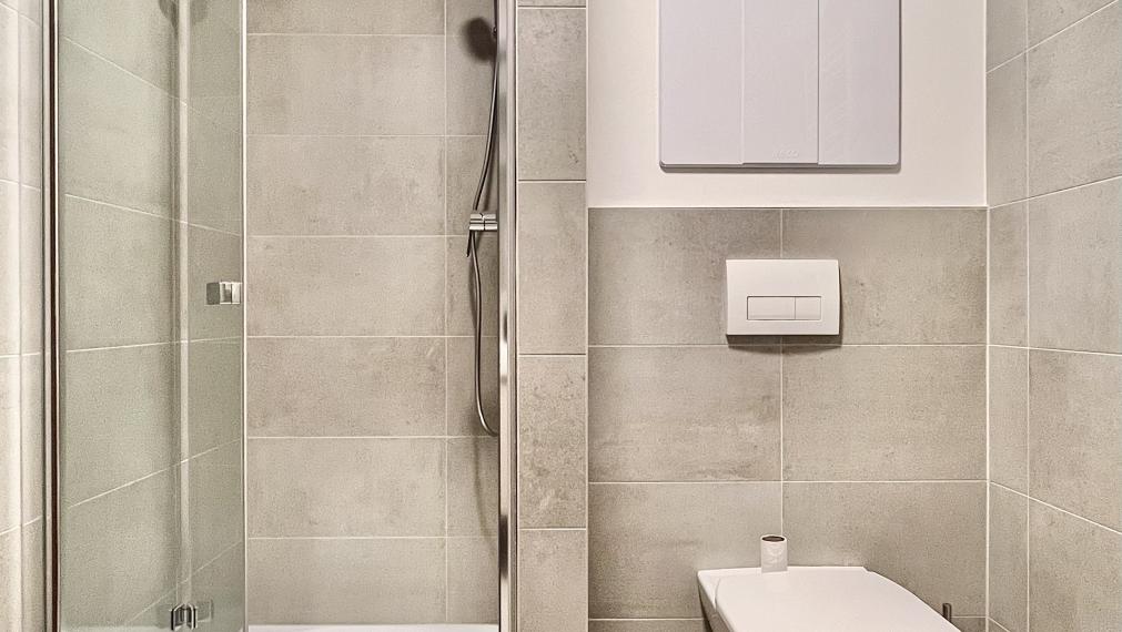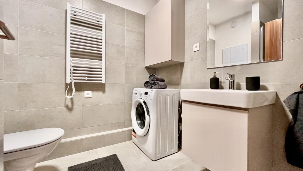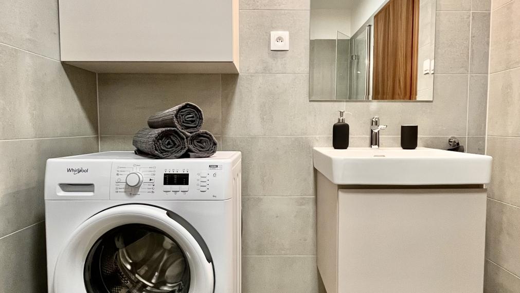 - חדר רחצה עם מקלחון מחובר לשירותים, כולל מכונת כביסה אוטומטית מבית Samsung