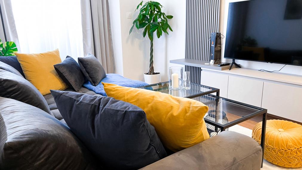 - סלון עם ספה נפתחת, שולחן קפה מזכוכית עם שטיח רך, טלוויזיה רחבה מבית Samsung