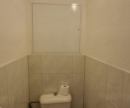 - מצד שמאל נמצא חדר רחצה מרווח עם שירותים ומספיק מקומות אחסון, מעוצב בגוונים בז' נעימים