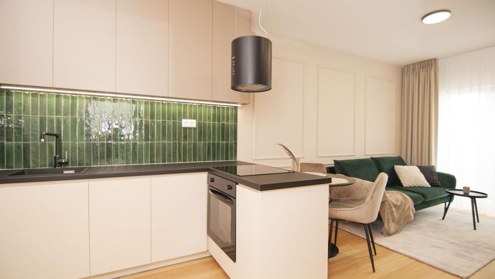 - Кухня: встроенная мебель с техникой (духовка с горячим воздухом, посудомоечная машина, холодильник с морозильной камерой, стеклокерамическая индукционная плита, вытяжка)