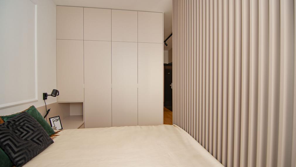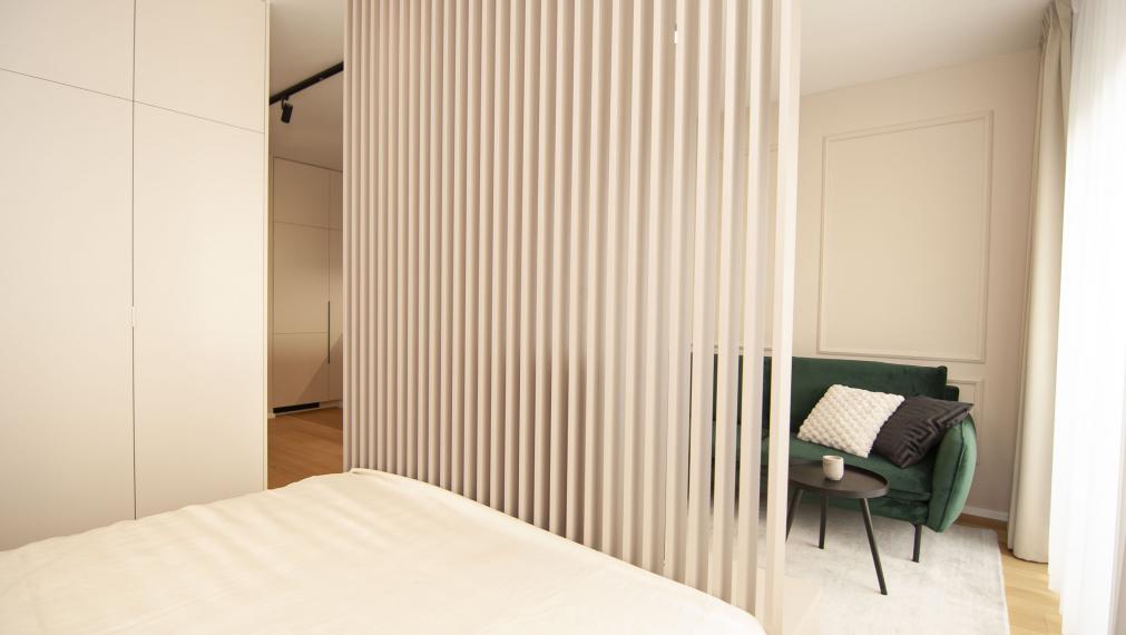 - зону спальни, отделённую декоративной перегородкой, с просторным шкафом