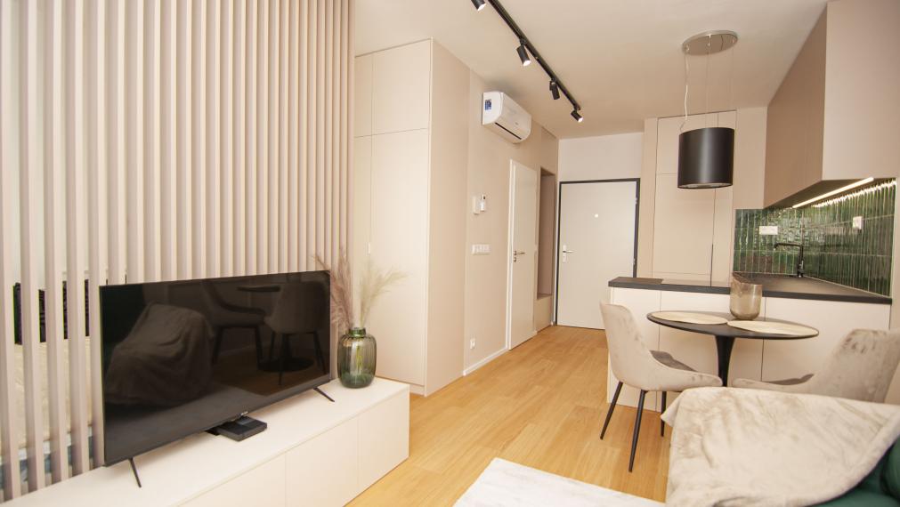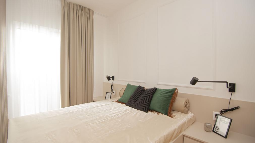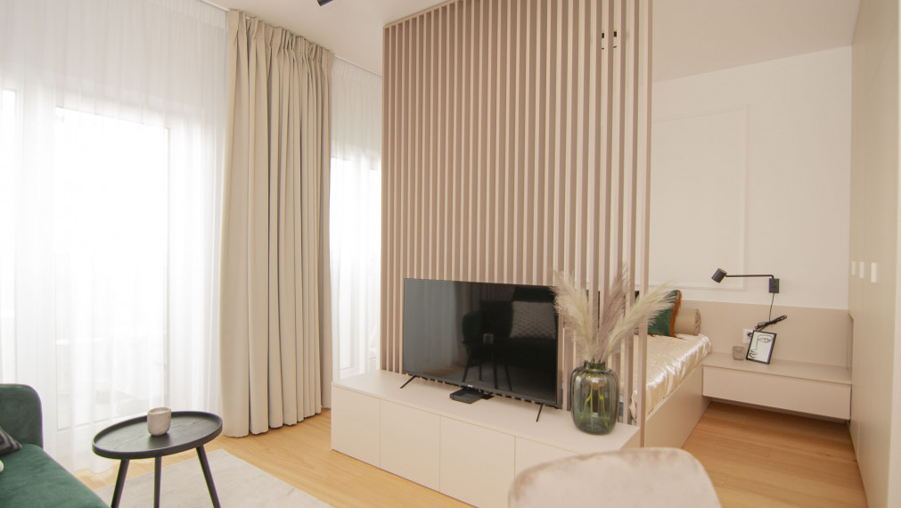 - Комната: обеденный стол с стульями, диван, журнальный столик, умный LED-телевизор, кровать 160х200, вместительный шкаф, прикроватные тумбочки