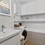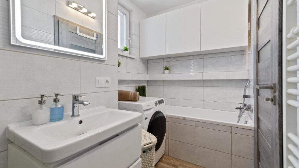 - Ванная комната с отдельной ванной, душевой кабиной и местом для стиральной машины, светодиодное зеркало