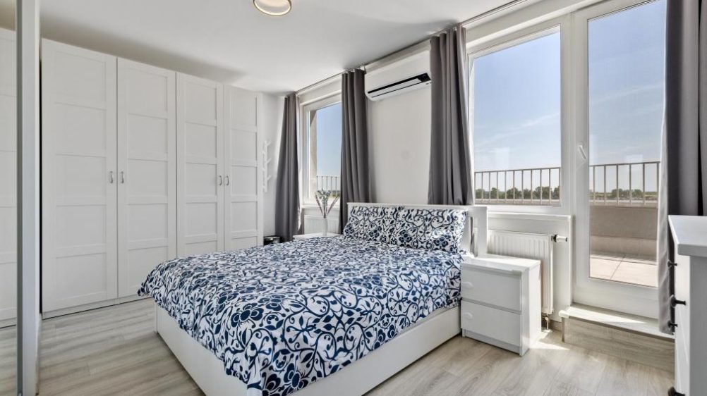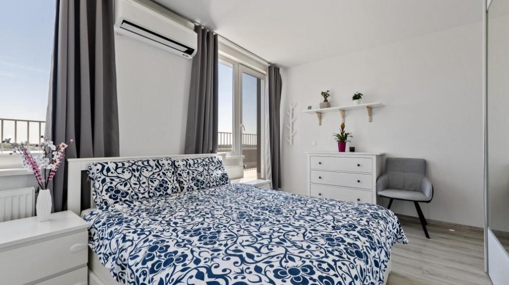 - Спальня с выходом на террасу ЮВ, видом на восход солнца и Malý Raj, раздвижные двери + шкафы PAX
