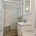 - Ванная комната с душевой кабиной и ванной, светодиодным зеркалом, полотенцесушителем
