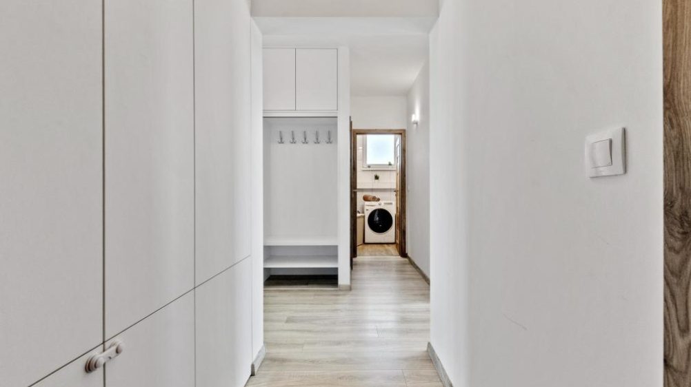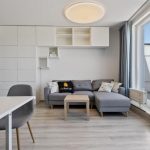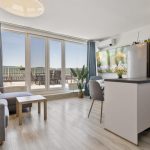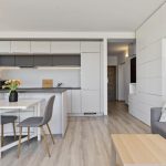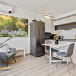 - Кухонный гарнитур: L-образный с островом, подсветка светодиодной лентой с регулировкой интенсивности света, встроенная бытовая техника: варочная панель Bosch + электрическая духовка Beko, вытяжка, встроенная посудомоечная машина 60 см Bosch, 2 холодильника (1 отдельно стоящий, 1 встроенный), каменная раковина, раскладной L-образный диван, шкафы с системой push-to-open.