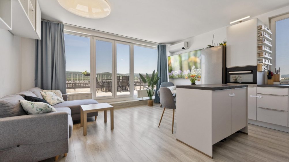- Гостиная с кухней и островом, раскладной обеденный стол с выходом на террасу СЗ с видом на Karpaty