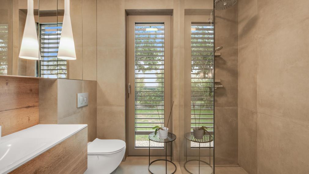 - Окна и жалюзи: алюминиевые трехкамерные окна Reyners и внешние алюминиевые жалюзи с встроенными коробами