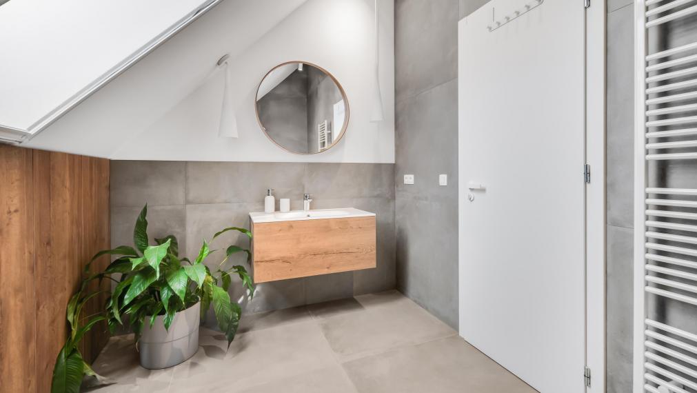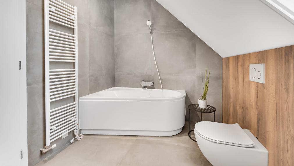- Большая ванная комната с угловой ванной и встроенными системами хранения