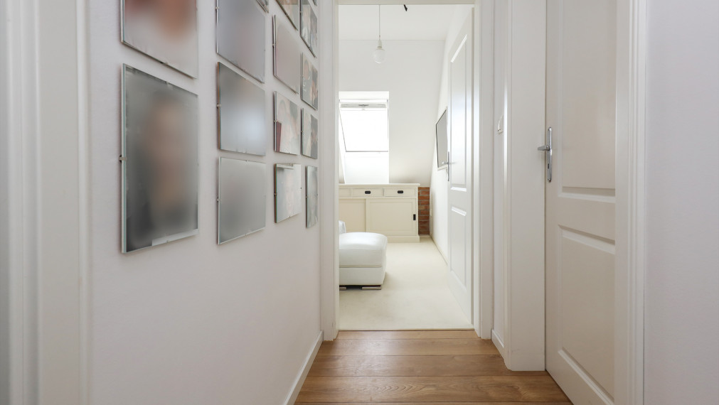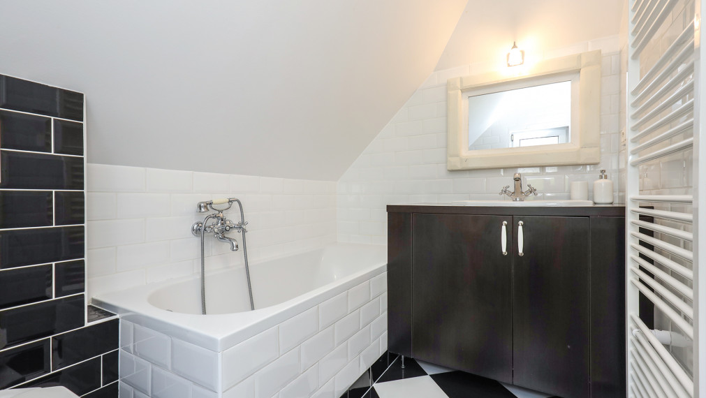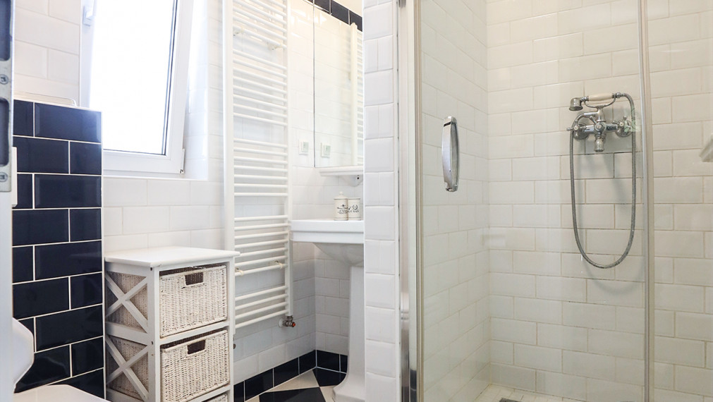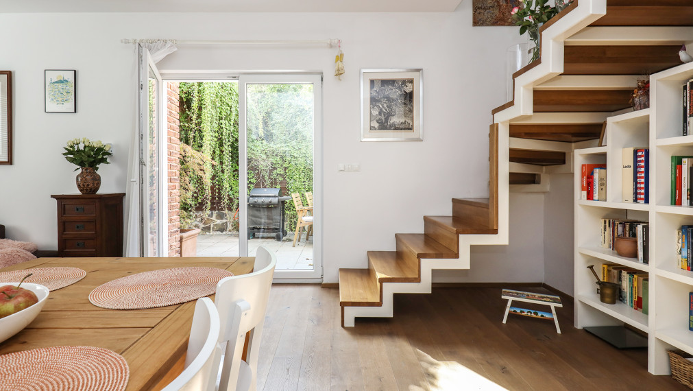 - первый этаж полезной площадью 65 м2 состоит из входного коридора, стильной черно-белой ванной комнаты (туалет, раковина и душевая кабина), комнаты, используемой в настоящее время как кабинет с гардеробной, просторной кухни с кладовой, которая ведет в гостиную с выходом на террасу и лестницы с книжным шкафом
