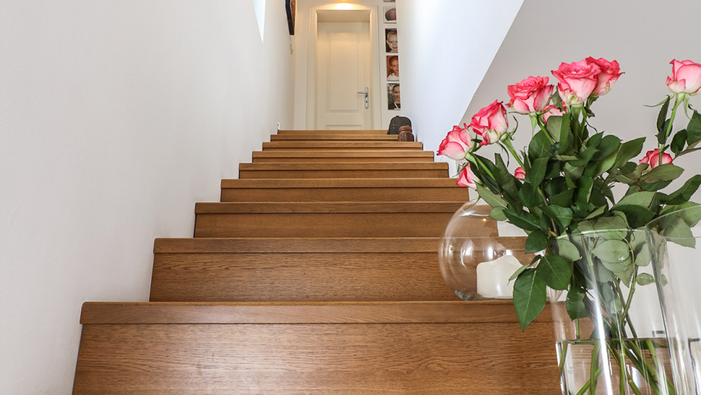 - полы в доме комбинированные: плитка и деревянный паркет, на верхнем этаже ламинат