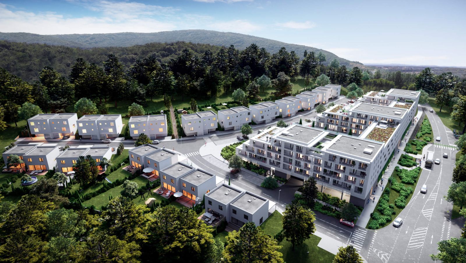 Жилой комплекс с рекреационным характером в районе с хорошим сообщением как с природной средой, так и с развивающимися северо-западными частями Братиславы.